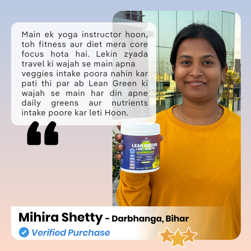 Goodveda Lean & Green’s greens like Wheatgrass and Alfalfa support smooth digestion and a healthier gut environment.
