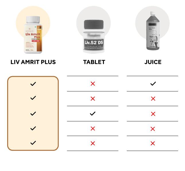 Liv Amrit Plus is an Ayurvedic liver supplement with clinically researched ingredients like NAC, Silymarin, and Kutki, which are not present in most liver health products. It not only detoxifies but also repairs liver damage and improves digestion.